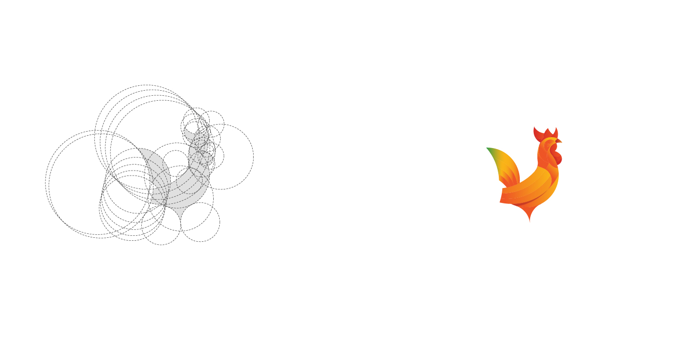 Animal logo design based on golden ratio circular grids. Rooster, panda, whale, fox, bird, sparrow, kangaroo.